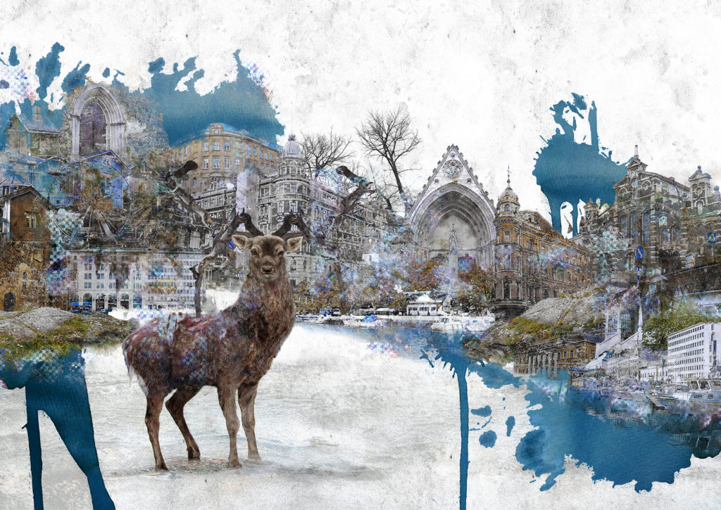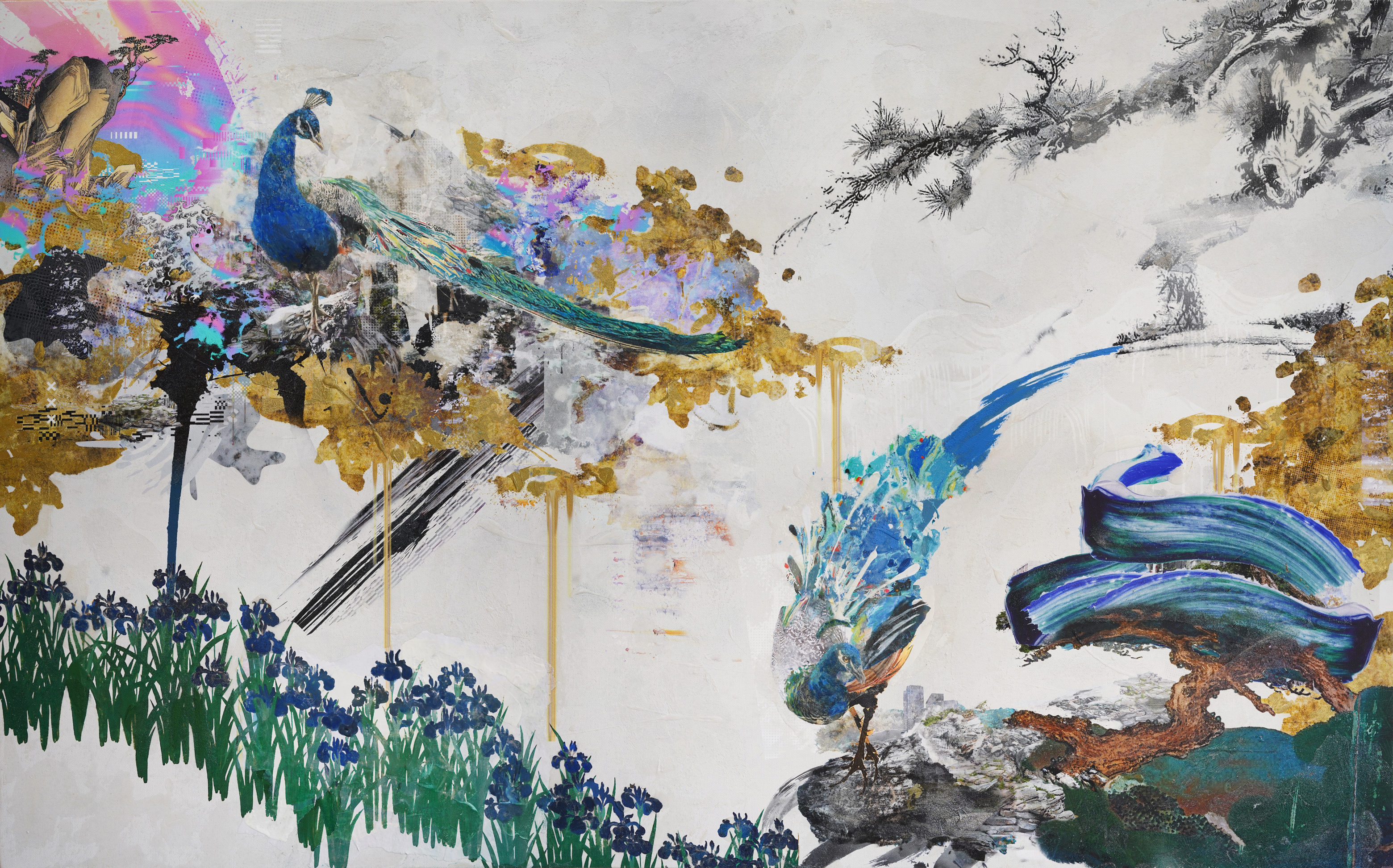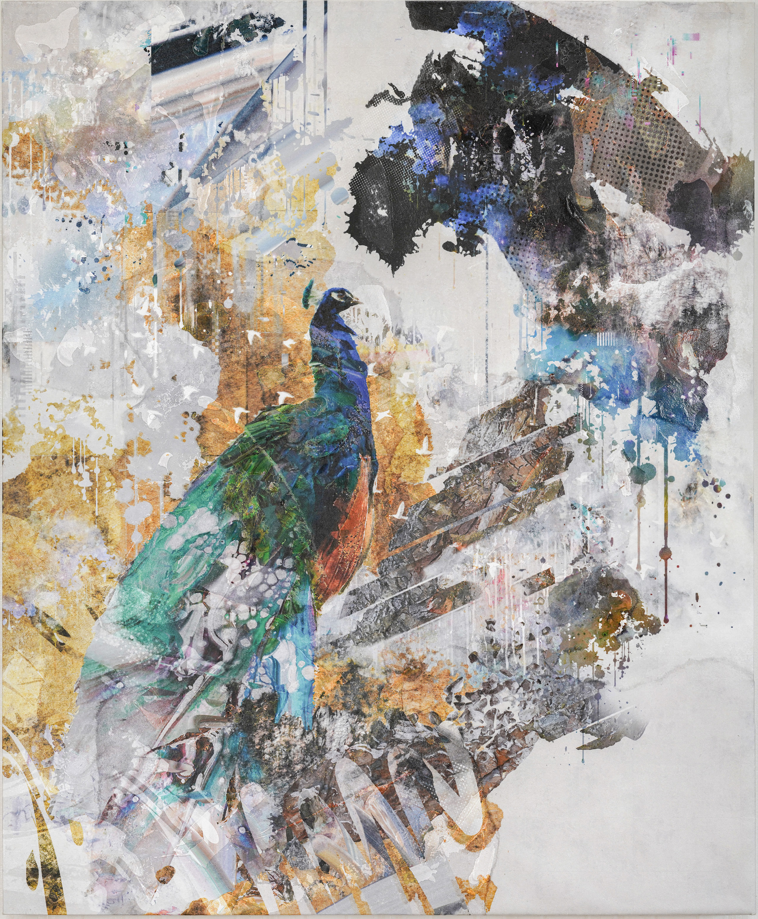 水彩画や写真、テクスチャをコラージュしていくことで、あらゆる事物が大きな潮流の中で渾然一体となり