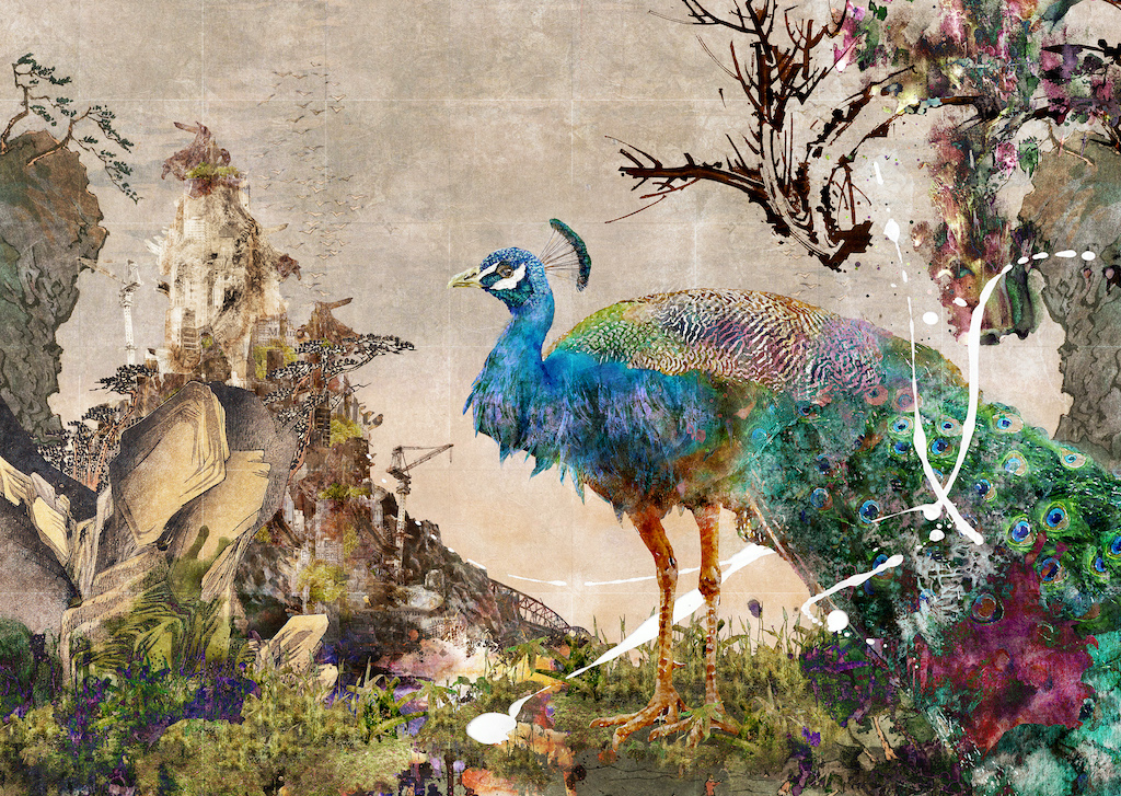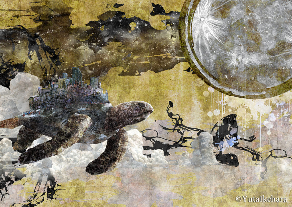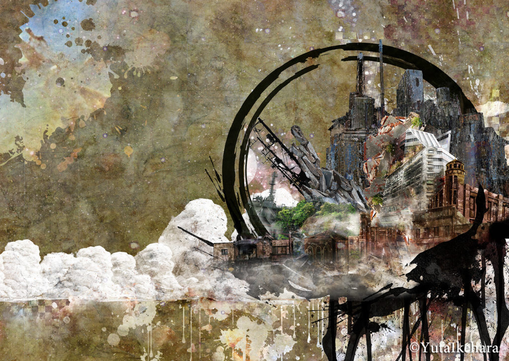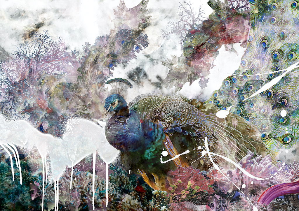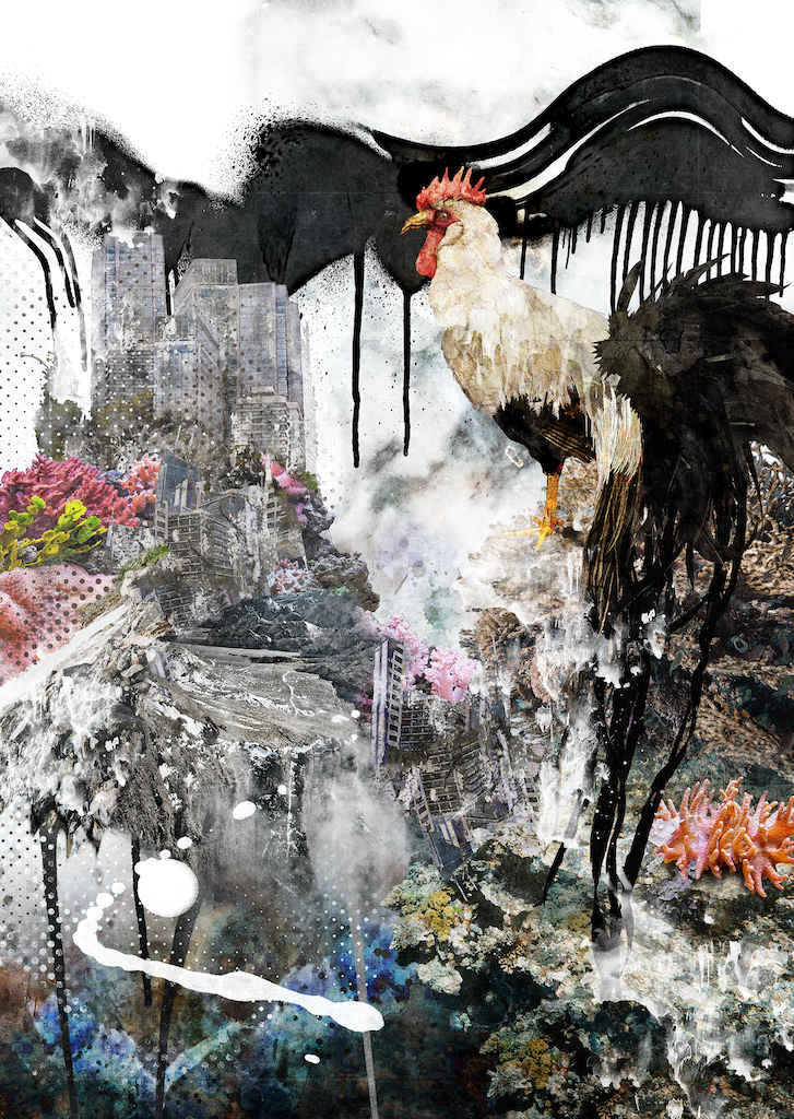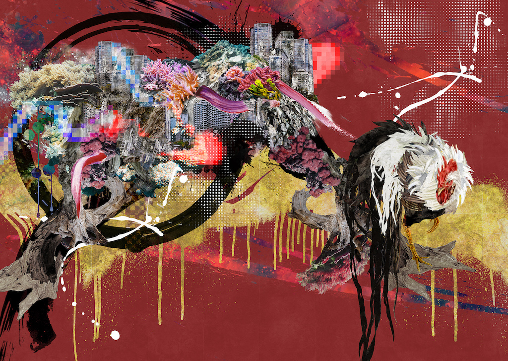 自然界を表す動植物や、人間社会を象徴する ノイズや人工物が混成する世界を描いています。