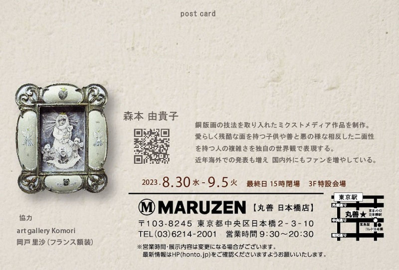 また、前回の個展「森本由貴子 個展 -Ironyお砂糖つけ-(開催期間2023.09.15(木)-2022.09.23(金 祝))」で好評だった、岡戸里紗 制作のフランス額装とのコラボレーション作品も展示予定しております。